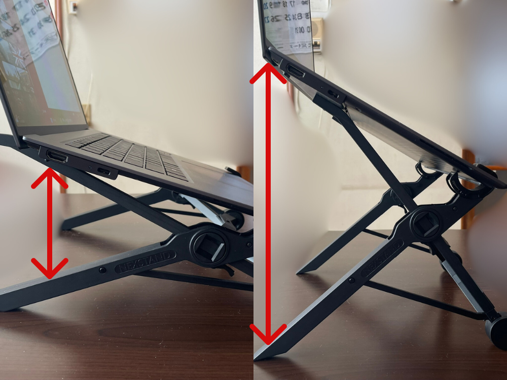 Nexstandはパソコン本体の位置ごと高く持ち上げ、別途キーボードを使用するタイプなので、手首への負担が少ないです。(高さは8段階まで調整可能)。