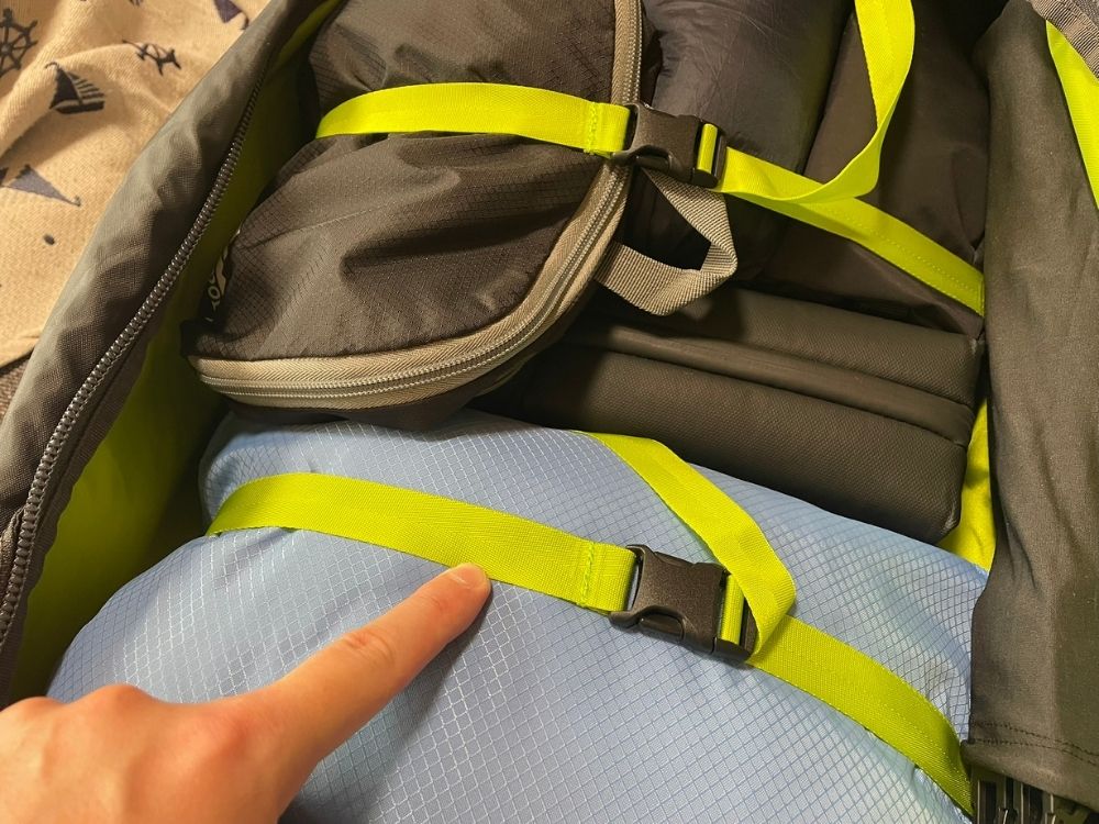 内部にあるコンプレッションベルトで荷物をしっかりと縛ることで、移動中に中身がずれる心配がありません 。
