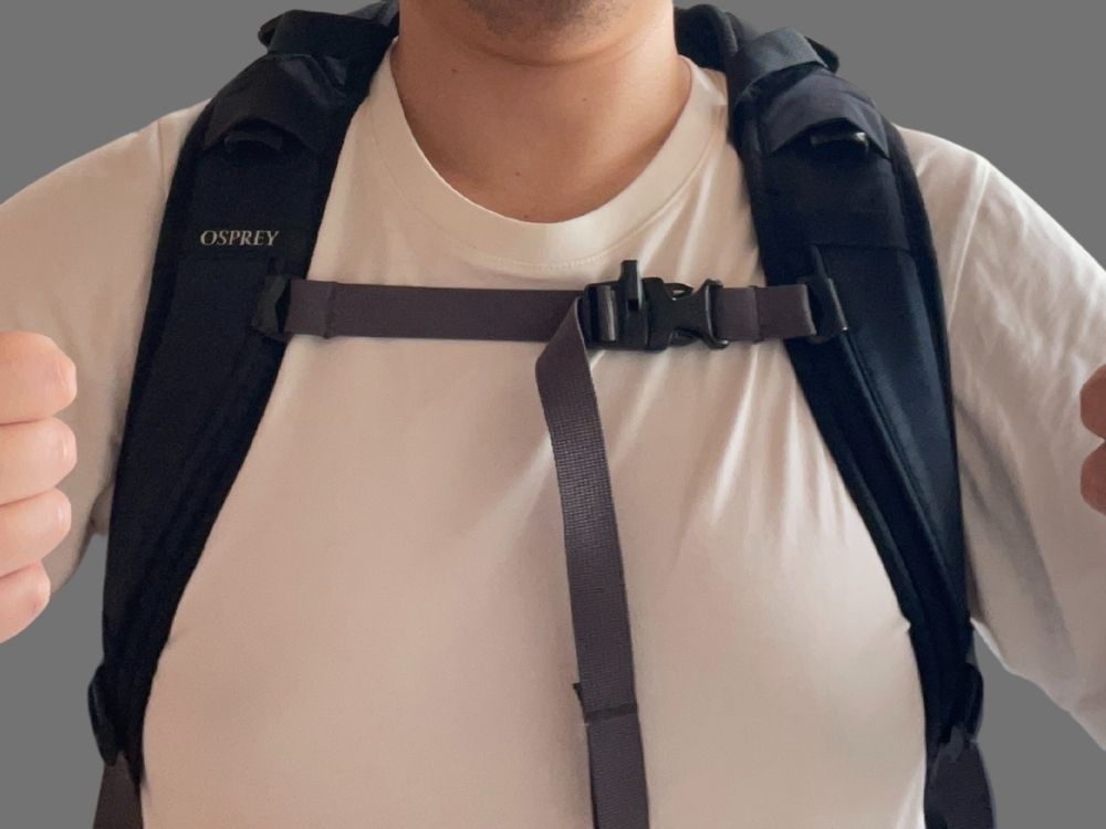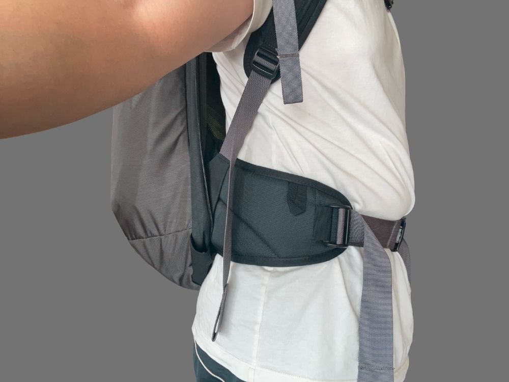 最後にチェストベルトを締めて、身体との一体感をより高めることができます。