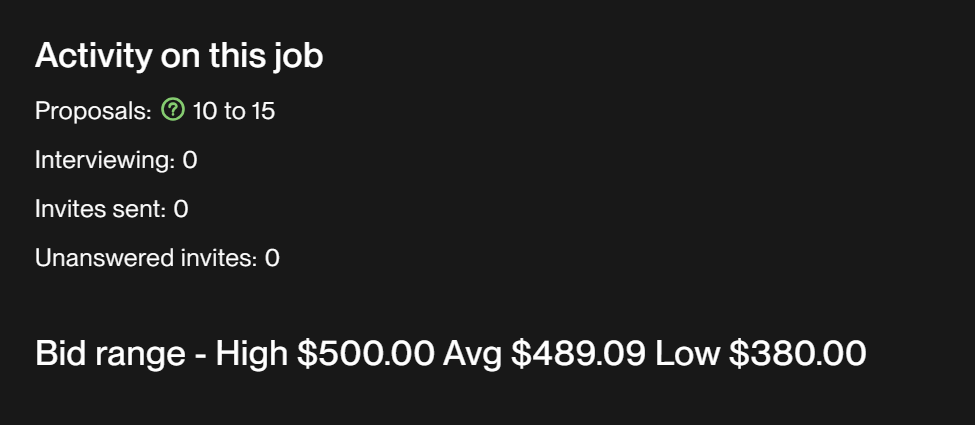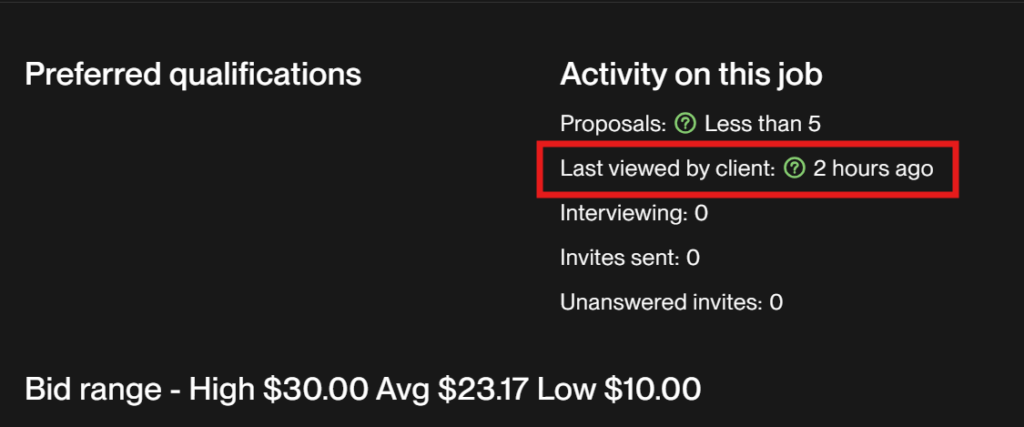 案件ページに「Activity on this job」という項目があります。「Last viewed by client 5 days ago」などの場合は、すでにクライアントの関心が薄れている可能性があります。