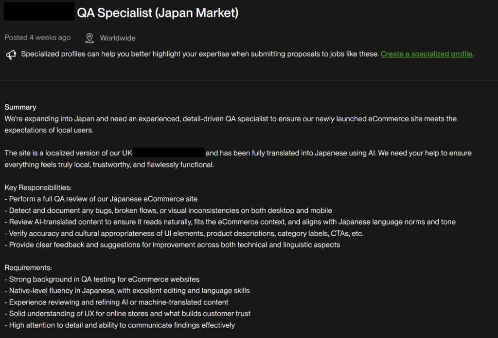 と言われたので、Upworkでの日本語ローカライズやMTPEの実績を軽く共有。